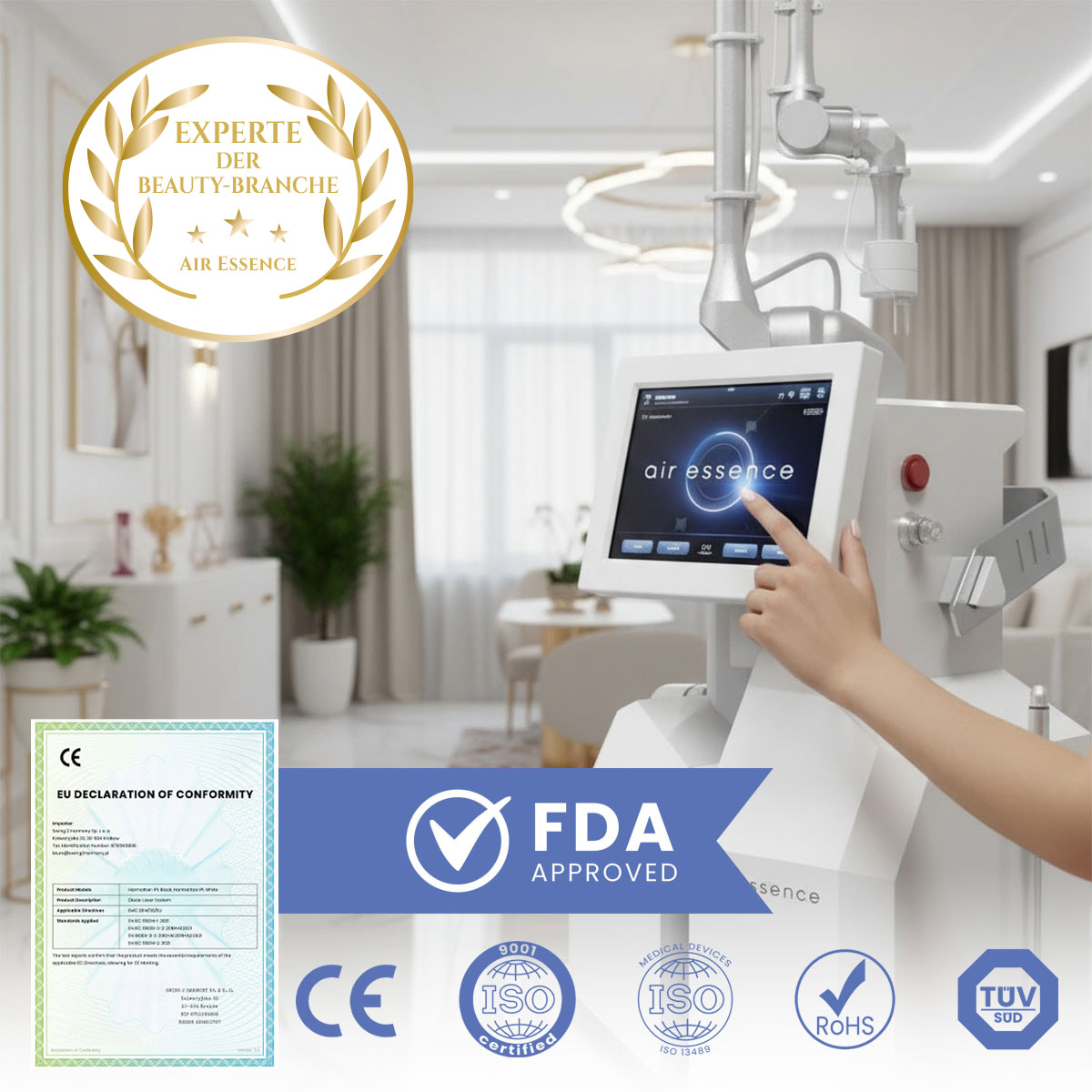 Unsere innovativen Geräte genießen das Vertrauen zahlreicher Kosmetiksalons, Physiotherapie-Praxen und Fachleute aus der Branche, nicht nur in Deutschland, sondern auch in ganz Europa und weltweit, über unsere weiteren Domains air-essence.store und air-essence.fr.
