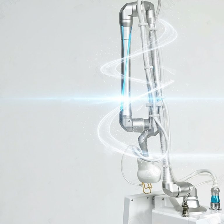 Der fraktionierte Air Essence™ Aramis A1 ist mit einem koreanischen siebengelenkigen Lichtführungsarm ausgestattet, der höchste Arbeitspräzision garantiert. Dank flexibler Konstruktion und großem Schwenkbereich ermöglicht der Arm ein sanftes Manövrieren des Handstücks in jede Richtung und gewährleistet eine exakte Führung des Laserstrahls.