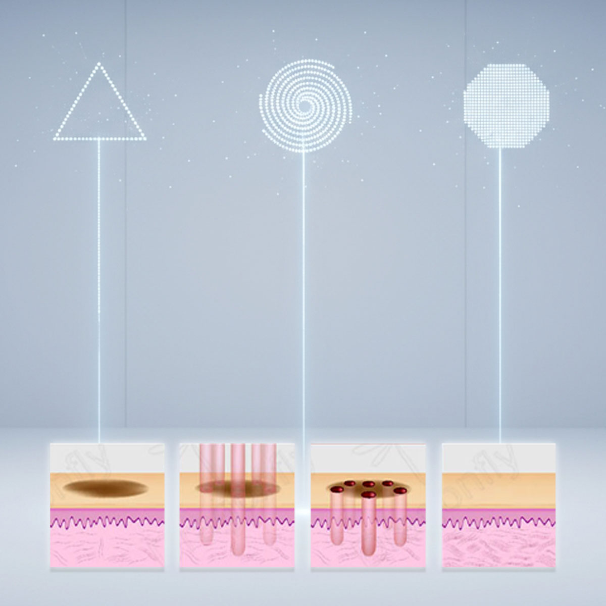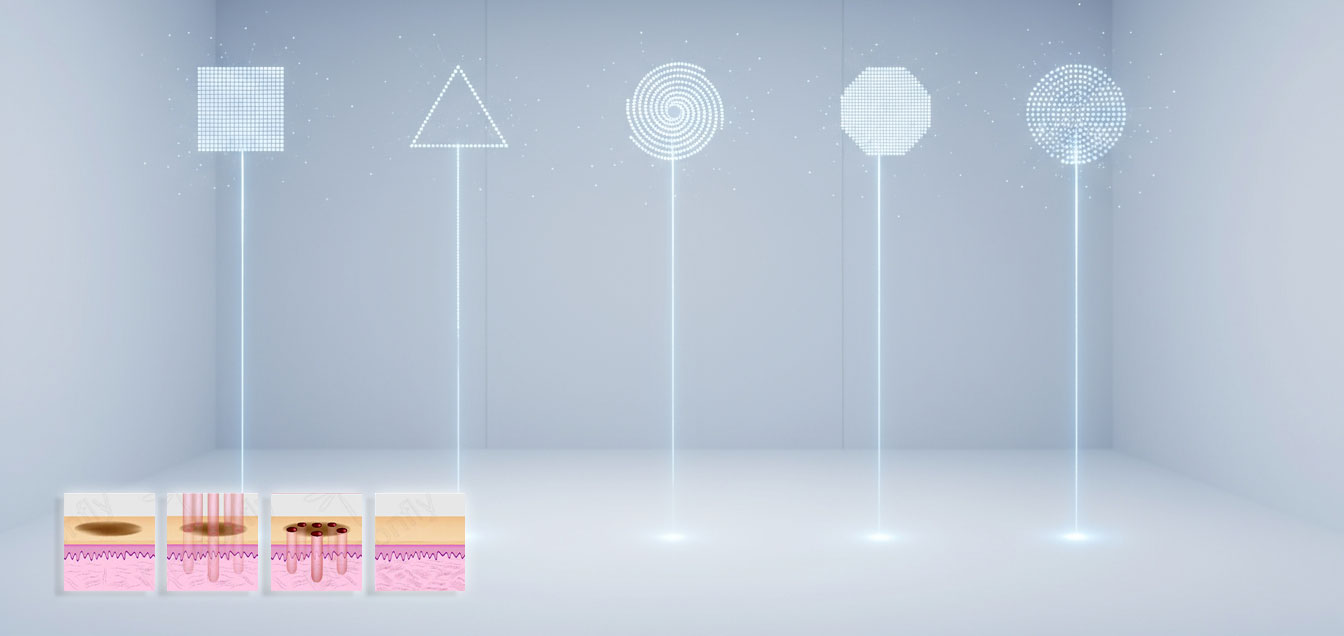 Das Gerät bietet 7 Scan-Modi, mit denen sich Form und Intensität des Strahls an die jeweilige Behandlungszone anpassen lassen. So kann präzise in der Dermis gearbeitet werden – ohne das umliegende Gewebe zu schädigen.