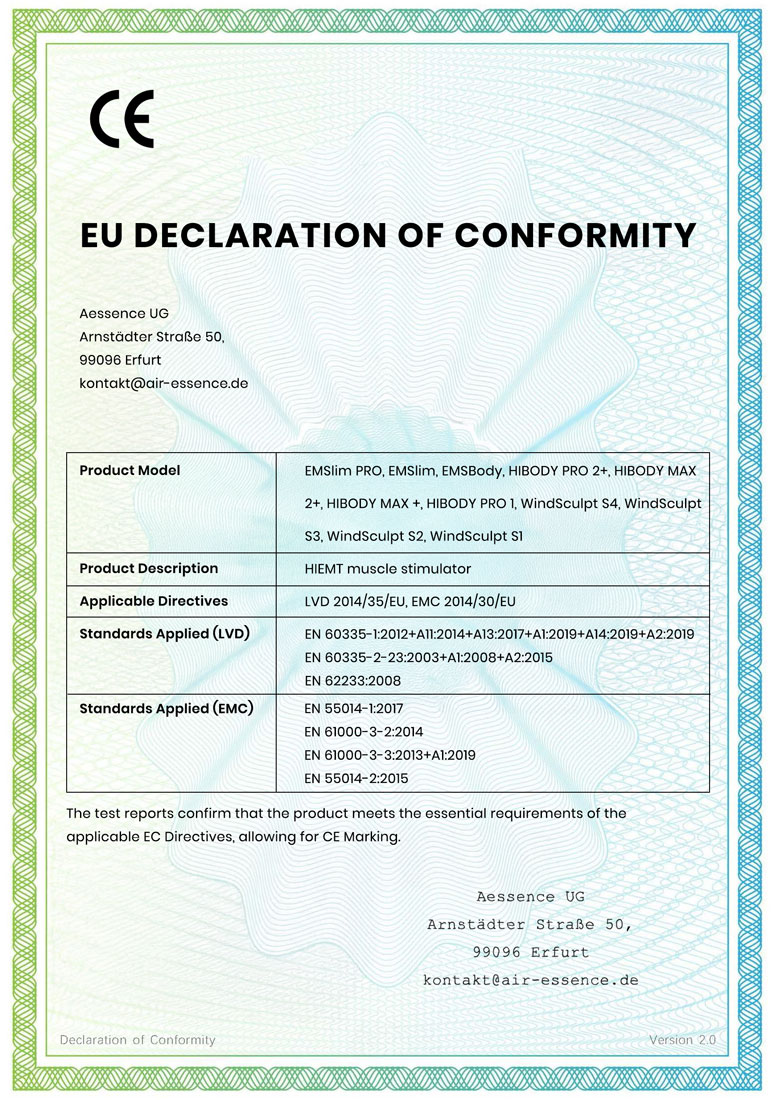 Unsere HIEMT-Muskelstimulatoren erfüllen höchste Qualitäts- und Sicherheitsstandards, bestätigt durch renommierte Zertifizierungen: