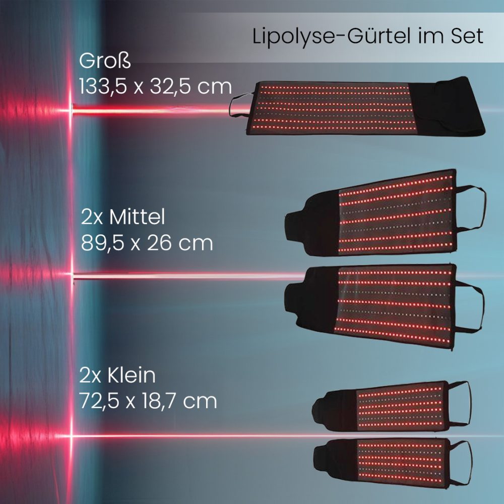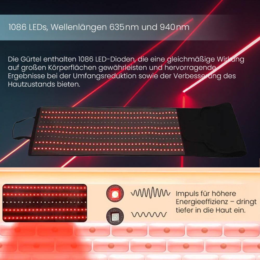 Die Gürtel enthalten 1.086 LEDs, die eine gleichmäßige Wirkung auf große Körperflächen ermöglichen – für eine effektive Umfangsreduzierung und Verbesserung des Hautbildes.