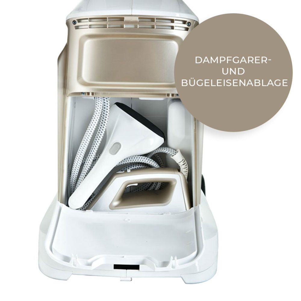 Die Möglichkeit des Zusammenklappens, Anhebens und Bewegens dank der eingebauten Rollen ermöglicht es, das Elysium mühelos dorthin zu bewegen, wo es gerade benötigt wird. Zusätzlich verfügt es über eine Aufbewahrungsmöglichkeit für das Bügeleisen und die Dampfbürste.