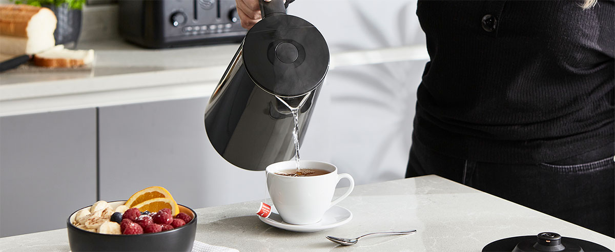 Dank der Cool Touch-Technologie müssen Sie sich keine Sorgen um Verbrennungen machen, selbst wenn der Wasserkocher eingeschaltet ist. Die doppelten Wände sorgen dafür, dass das Äußere des Geräts immer kühl bleibt. Darüber hinaus verfügt der Wasserkocher über einen Schutz gegen Überhitzung und gegen das Einschalten ohne Wasser. Ein eingebauter Filter hilft, Schmutz drinnen zu halten, und der um 360° drehbare Sockel und die Öffnungstaste machen die Bedienung extrem einfach.