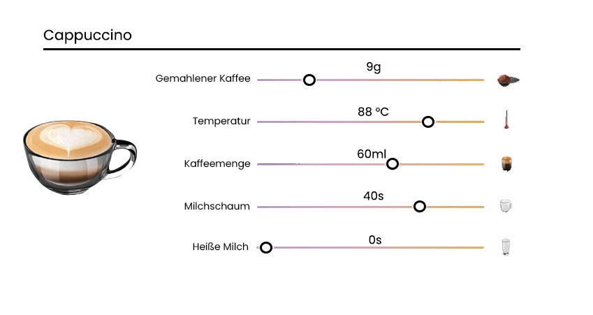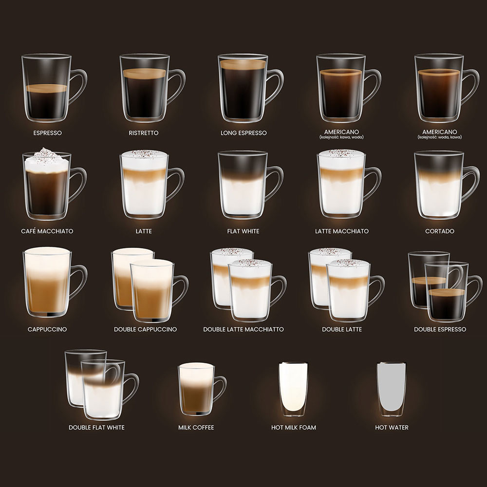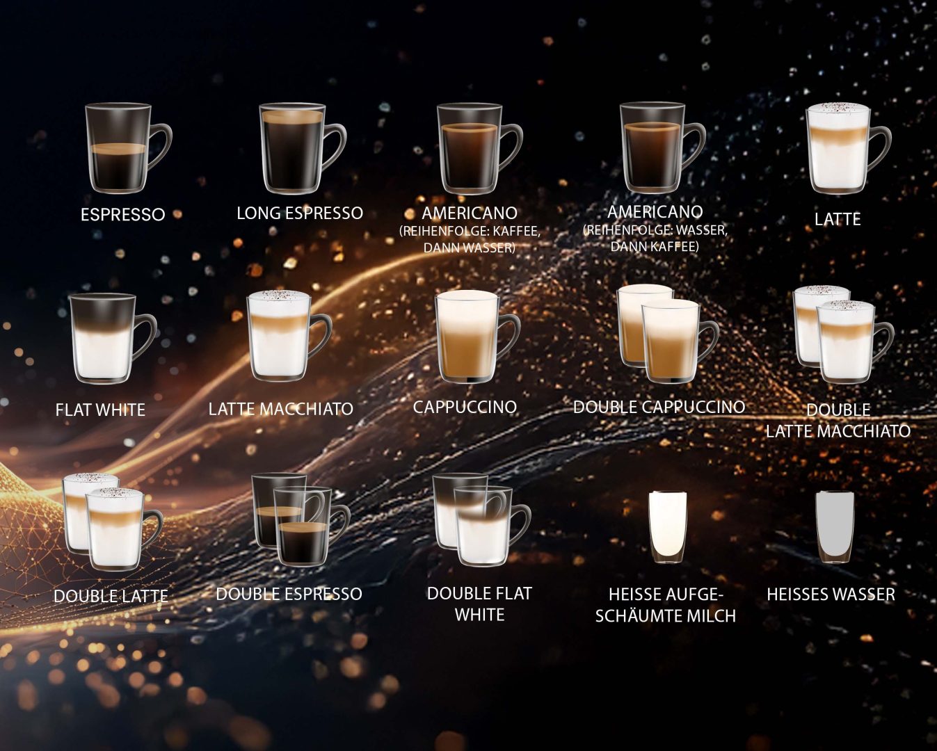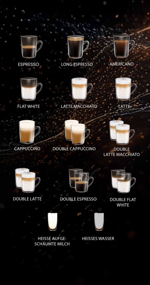 Espresso / Ristretto / Long Espresso / Americano (Kaffee-heißes Wasser) / Americano (heißes Wasser) / Cappuccino / Latte / Flat White / Cortado / Double Espresso / Double Latte / Double Flat White / Double Cafe Macchiato / Milchkaffee / Cafe Macchiato / Latte Macchiato / Tee / Heißes Wasser / Hot Milk Foam / Hot Milk