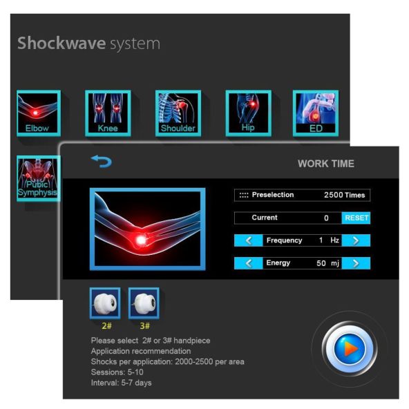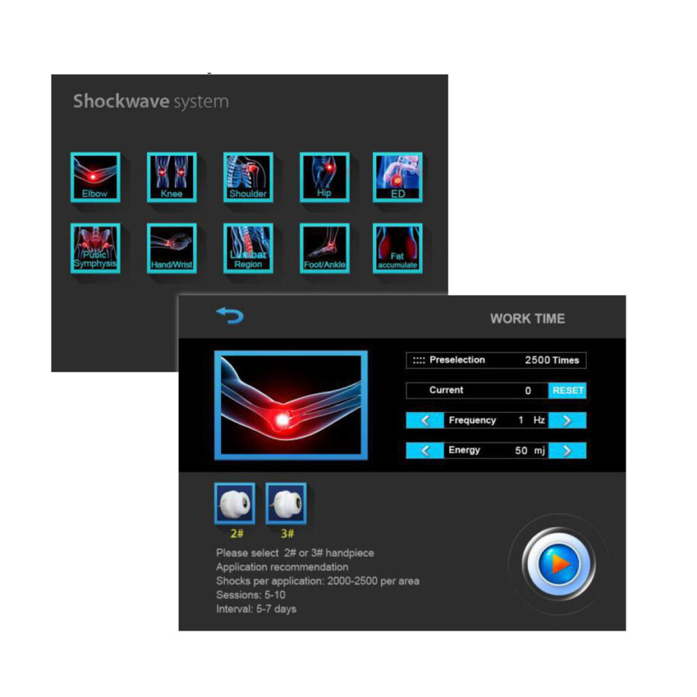 Das Gerät verfügt über ein benutzerfreundliches Menü, das die gezielte Auswahl von Körperbereichen wie Ellenbogen, Knie, Schulter, Hüfte oder Fuß ermöglicht – ebenso wie die Auswahl spezieller Therapieformen wie Physiotherapie, Cellulitreduktion.